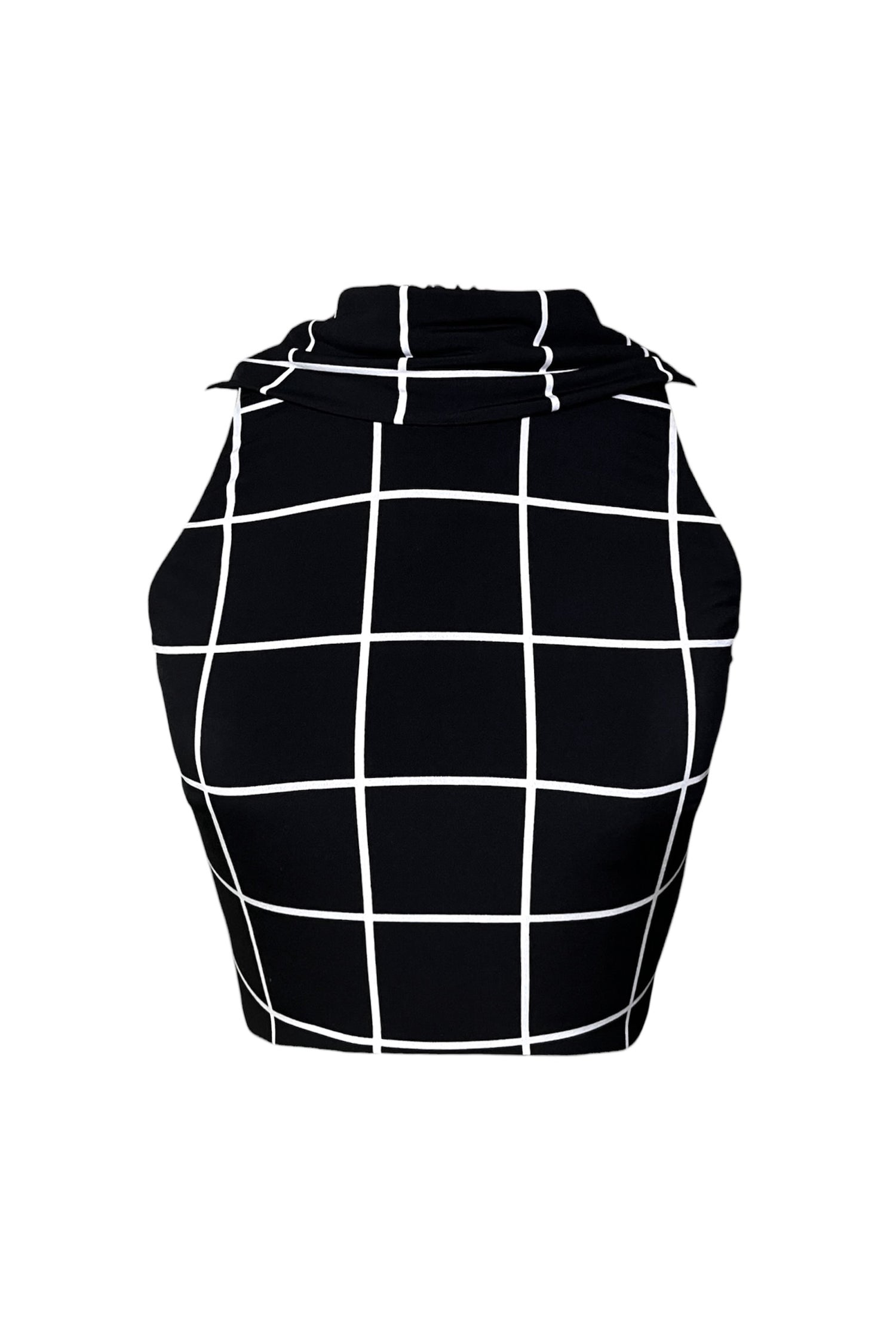 The sophisticated mock neck gives way to a breathtaking, dramatic cowl back, making a statement from every angle. Fully lined for a premium feel and ultimate comfort, this top features our versatile black and white plaid stretch jersey that stays crisp and wrinkle-free all day long.