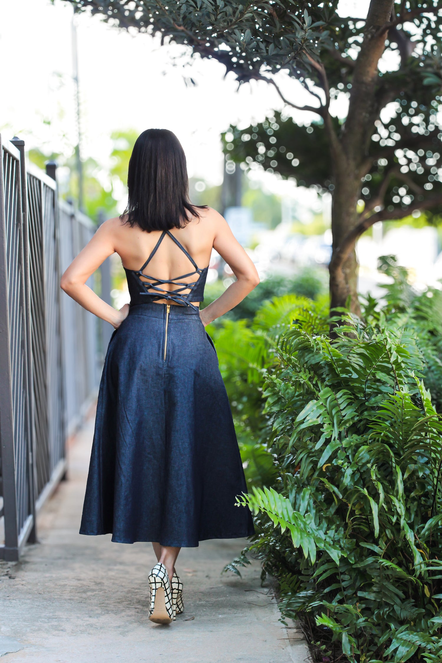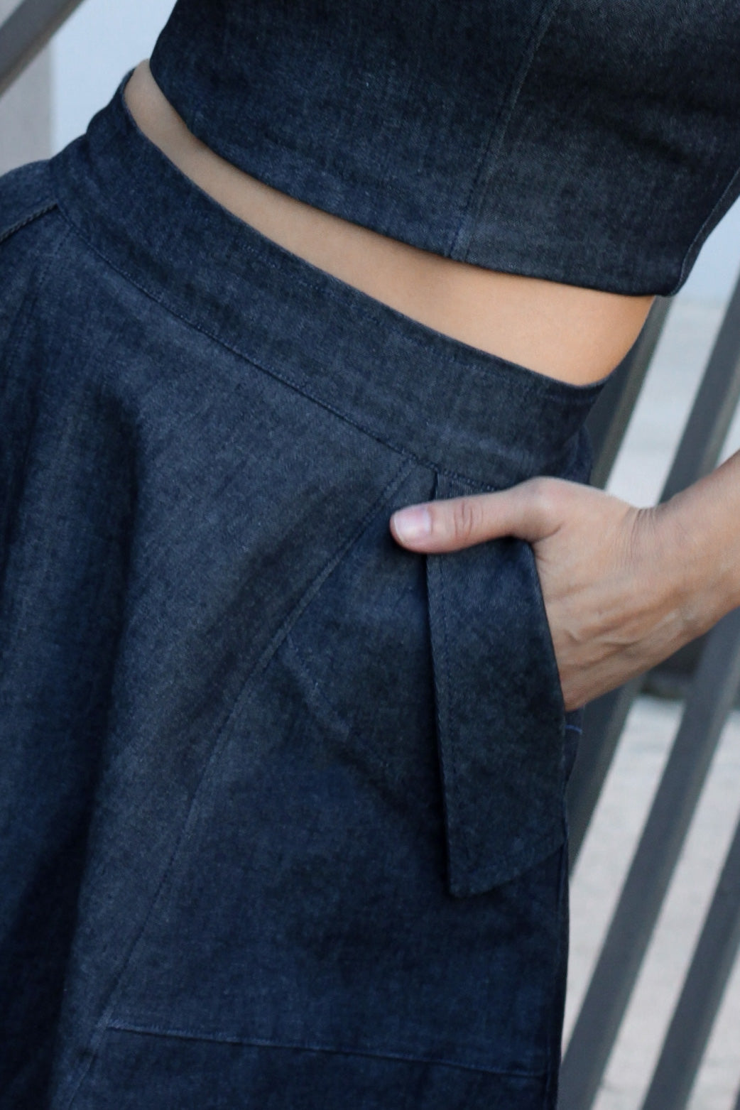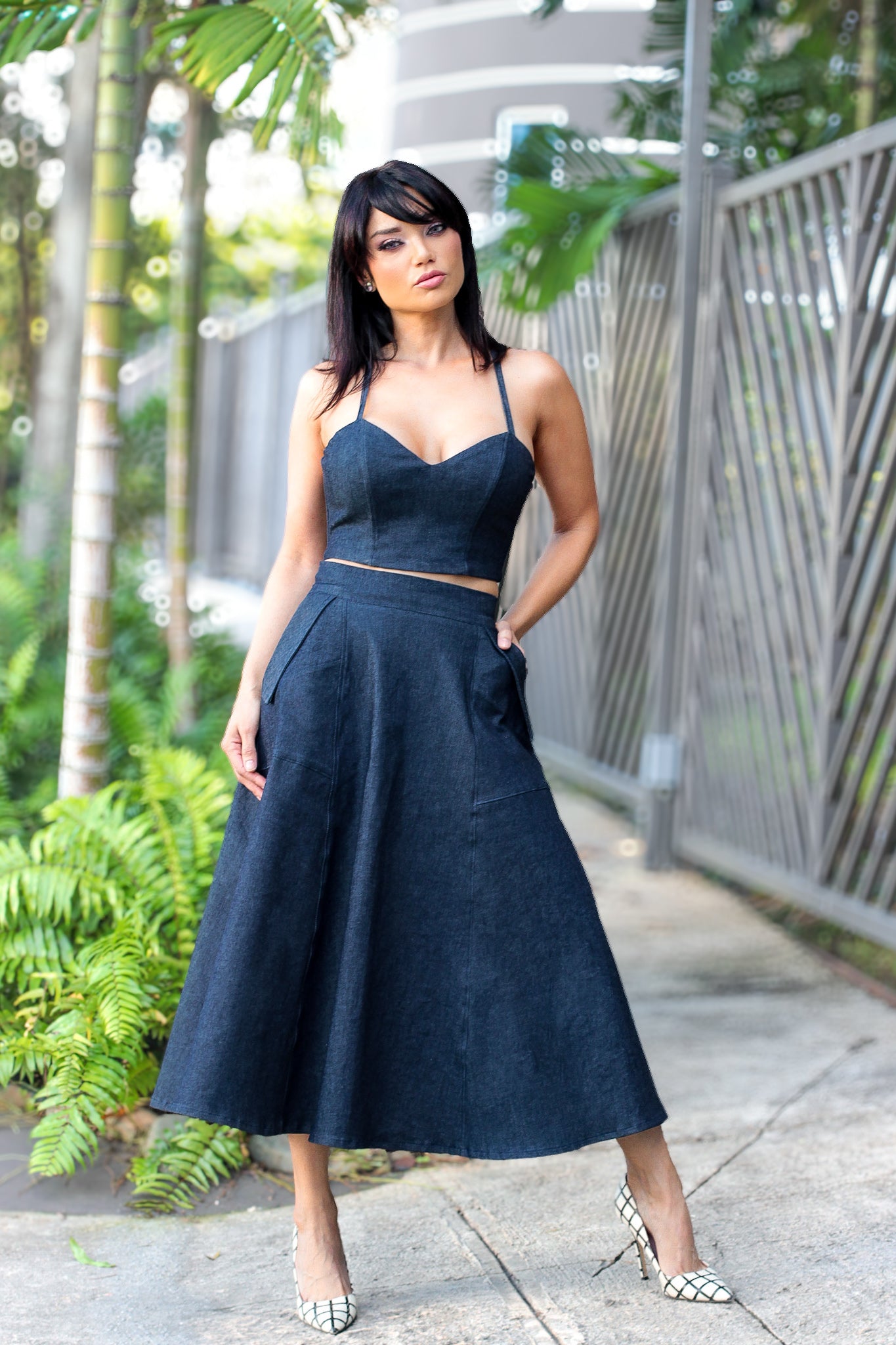 The Emily High Waisted Denim Midi Skirt & Cropped Top Set by Maritza Camareno is back by popular demand. This two-piece denim set is designed for versatility, durability, and timeless style. Handcrafted in Puerto Rico, it features a flattering denim cropped top paired with a sophisticated high waisted denim midi skirt. Wear them together for an elevated look or style each piece separately for endless options.