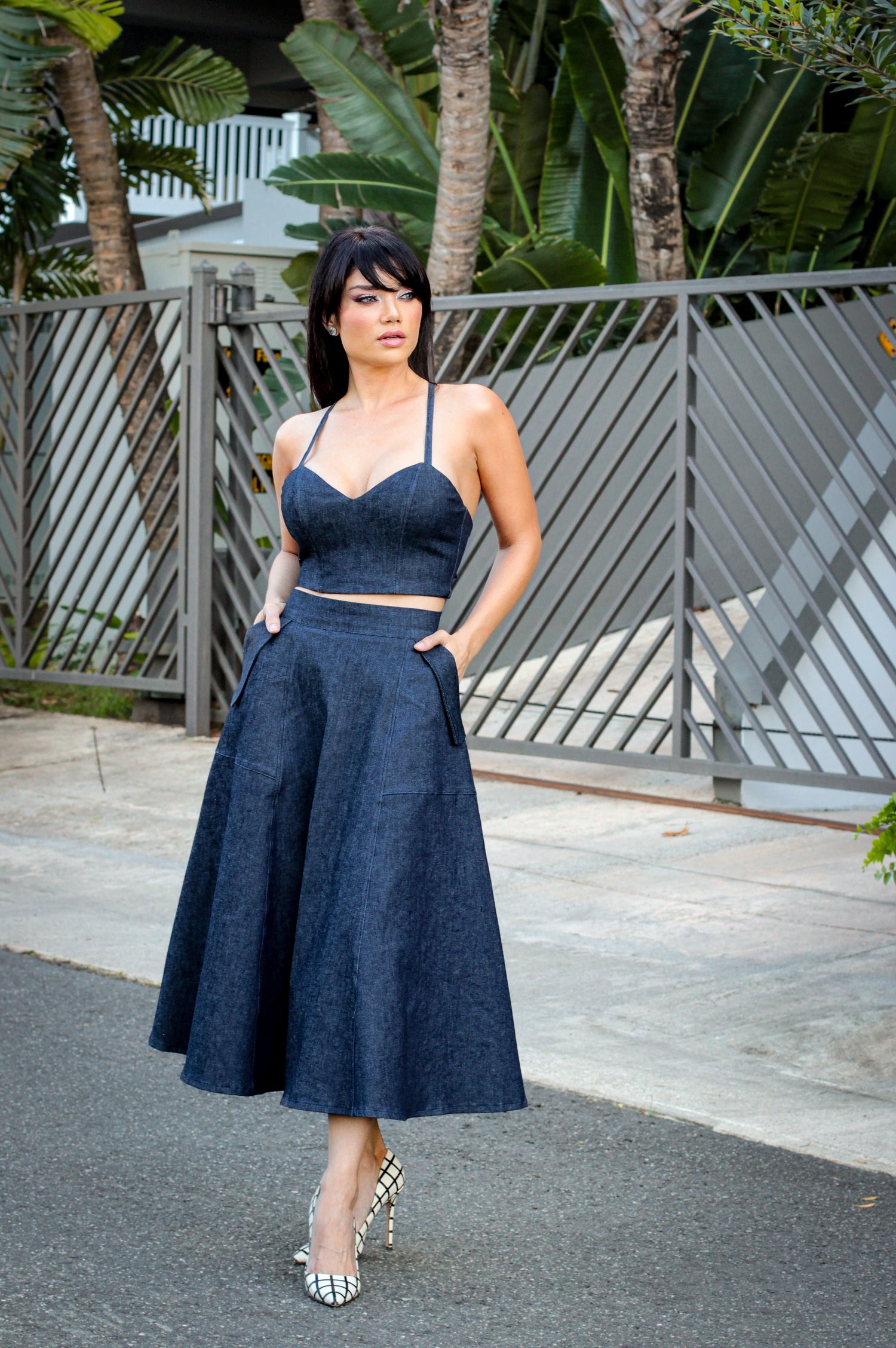Emily High Waisted Denim Midi Skirt & Cropped Top Set (Pre-Order)