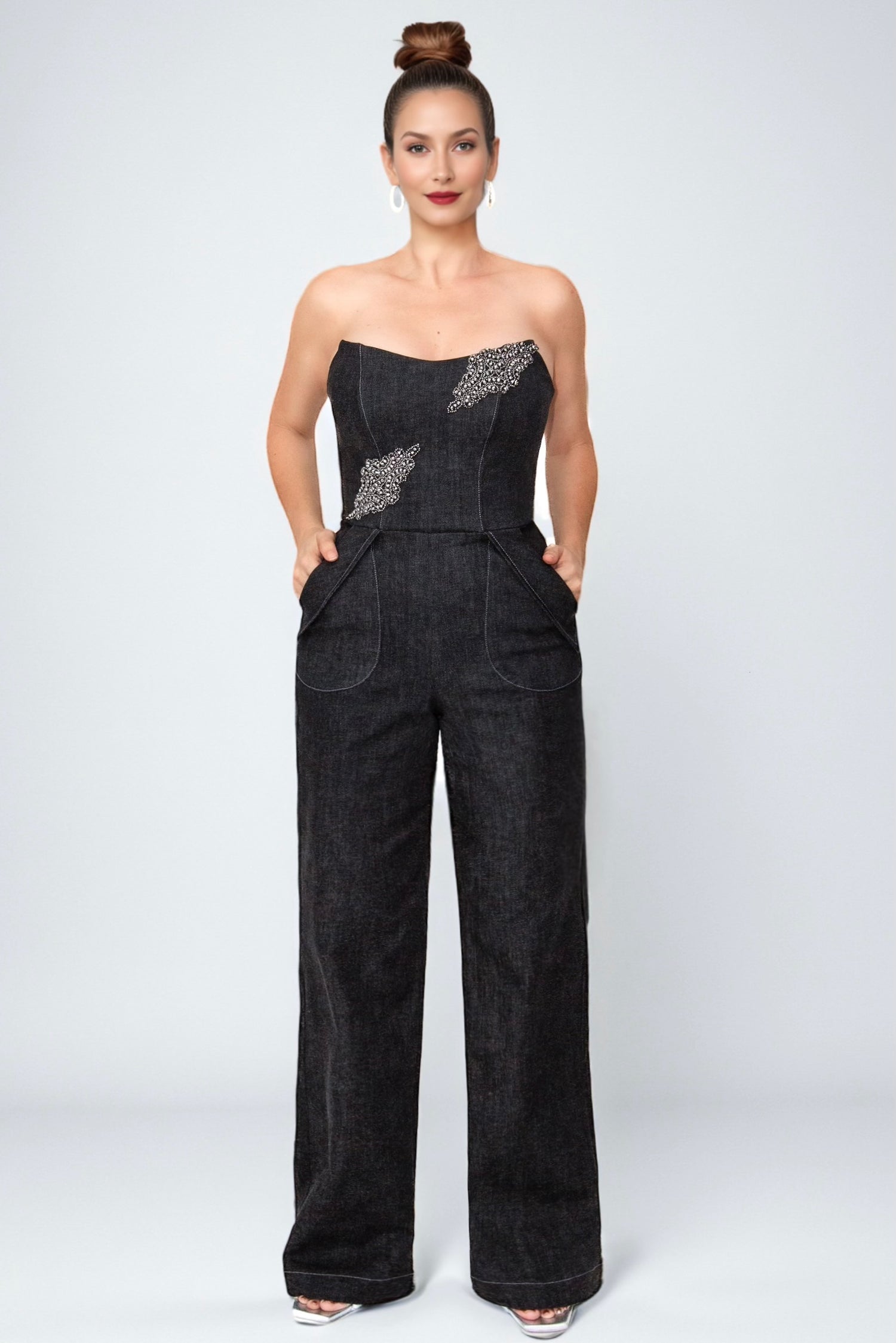 Empowering Black Denim Bustier Jumpsuit | Stone Embroidered Apliqué