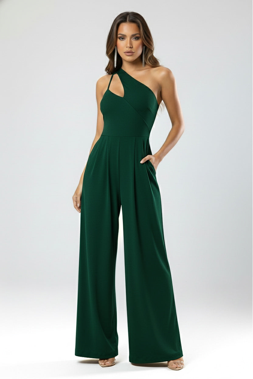 This beautiful jumpsuit features an asymmetrical neckline, a fitted torso with a cutout accent and a wide-leg silhouette for extra comfiness. Pair it with high heels for a night out or some wedges sandals for a day look.