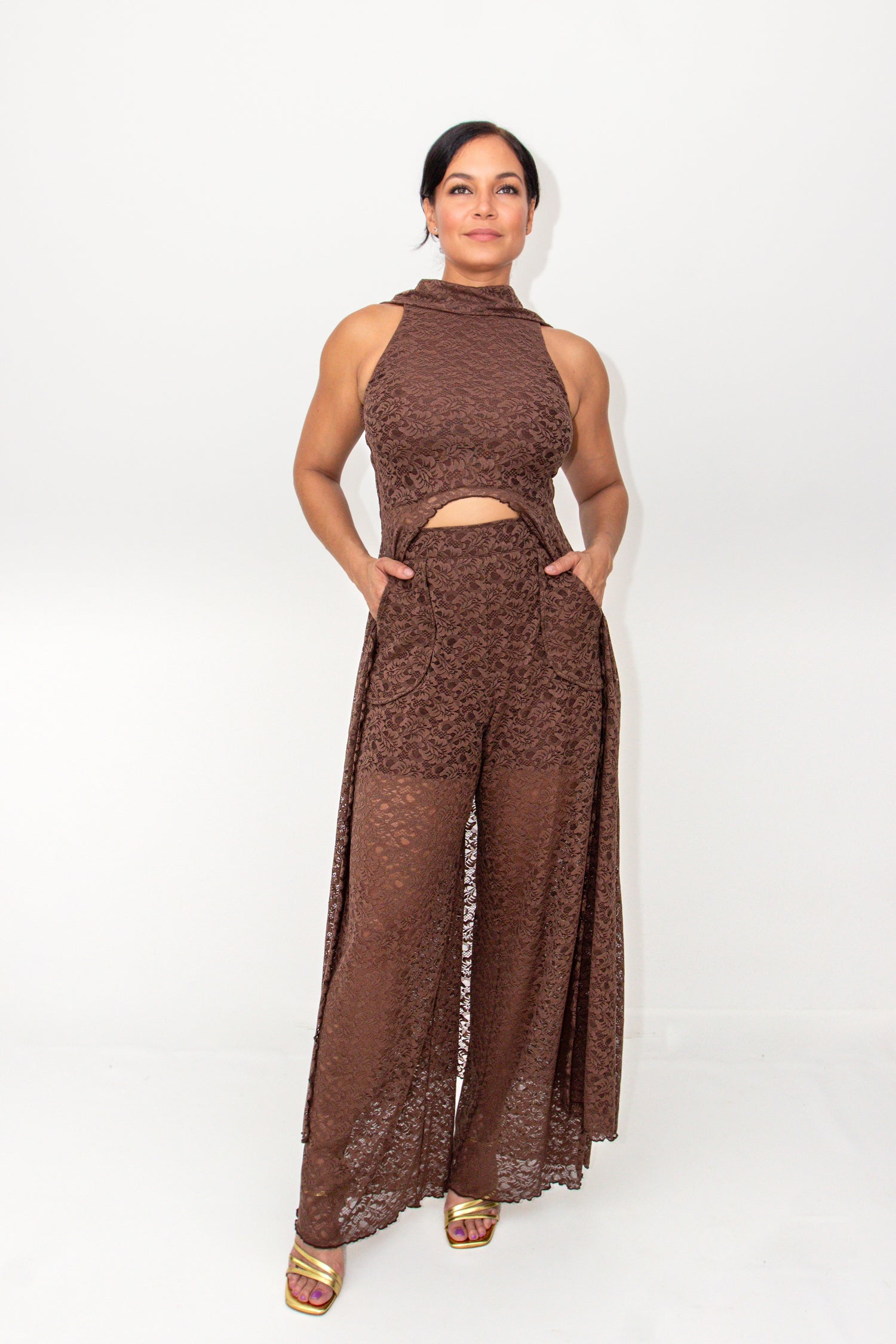The Confident Muse Set – Lace Tunic & Wide-Leg Pants with Cowl Back in Mocha